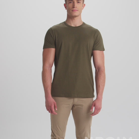 Camiseta de manga corta, confeccionada con tejido en galga fina y acabado compactado. Cuello redondo con 4 capas, cubrecosturas reforzado en cuello y hombros. Costuras laterales.