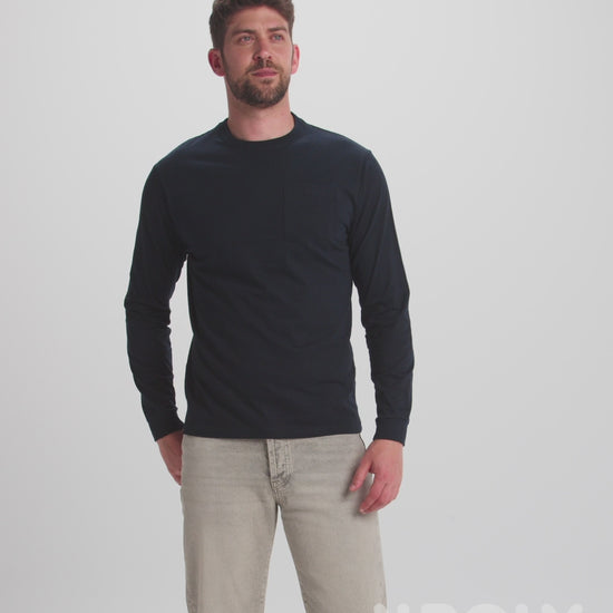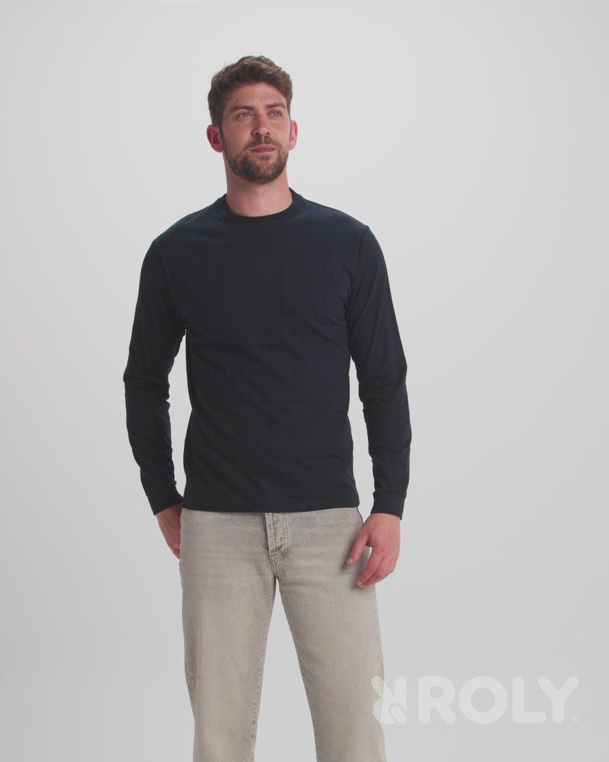 Camiseta de manga larga con cuello redondo y puños en canalé 1x1. Bolsillo en pecho izquierdo. Cubrecosturas reforzado en cuello y hombros.