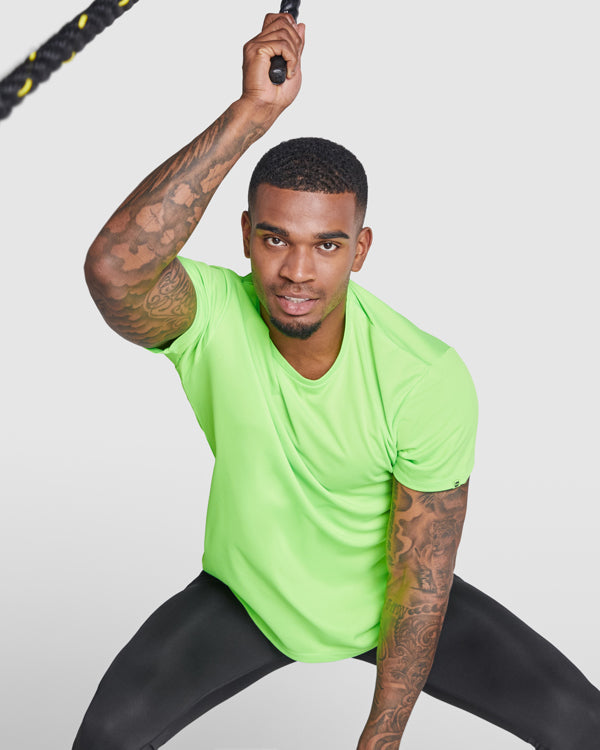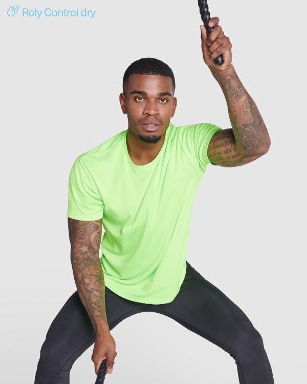 Camiseta técnica de manga corta con tejido de poliéster Reciclado CONTROL DRY. Cuello redondo con cubrecosturas a tono. Etiqueta identificativa con logo ECO en manga. Embolsado en material reciclado.