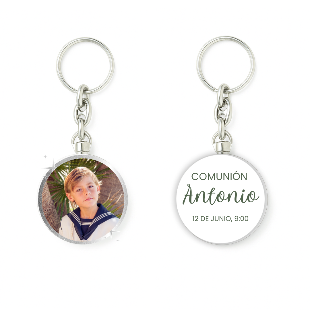 Este llavero exclusivo para comuniones presenta un diseño doble cara que permite personalizarlo con fotos, convirtiéndolo en un recuerdo único y especial.