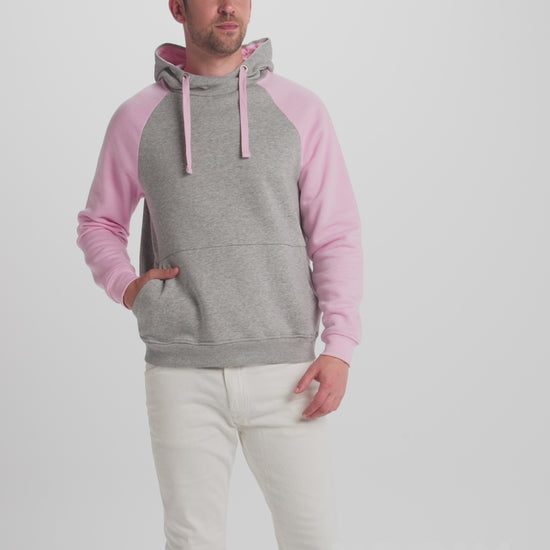 Sudadera bicolor unisex. Capucha con cuello cruzado y ojales metálicos, interior y cordones a contraste. Manga estilo ranglán a contraste. Bolsillo canguro. Puños y bajo con punto canalé con elastano 1x1.