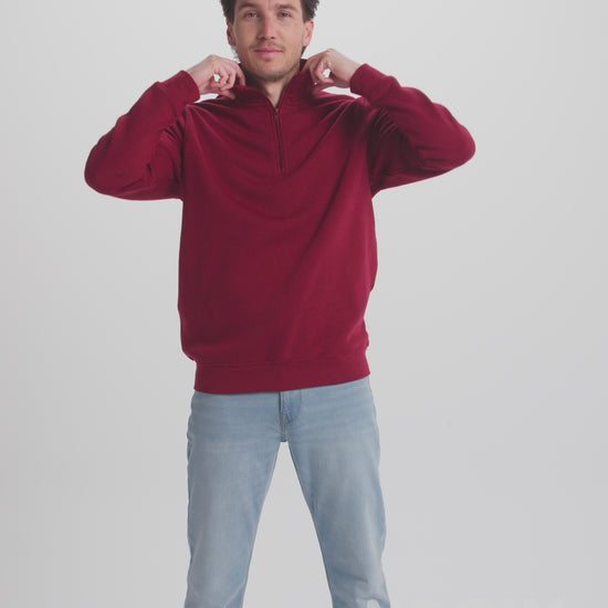 Sudadera con media cremallera a tono y cuello alto. Vista interior del cuello en el mismo tono. Cubrecosturas reforzado en el interior del cuello. Punto canalé 1x1 en puños y cintura.