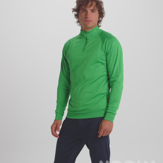 Sudadera de manga ranglán, con Interior perchado, cuello con media cremallera y cubrecosturas de refuerzo en su interior a tono. Parte posterior del cuello, puños y bajo en canalé 1x1.